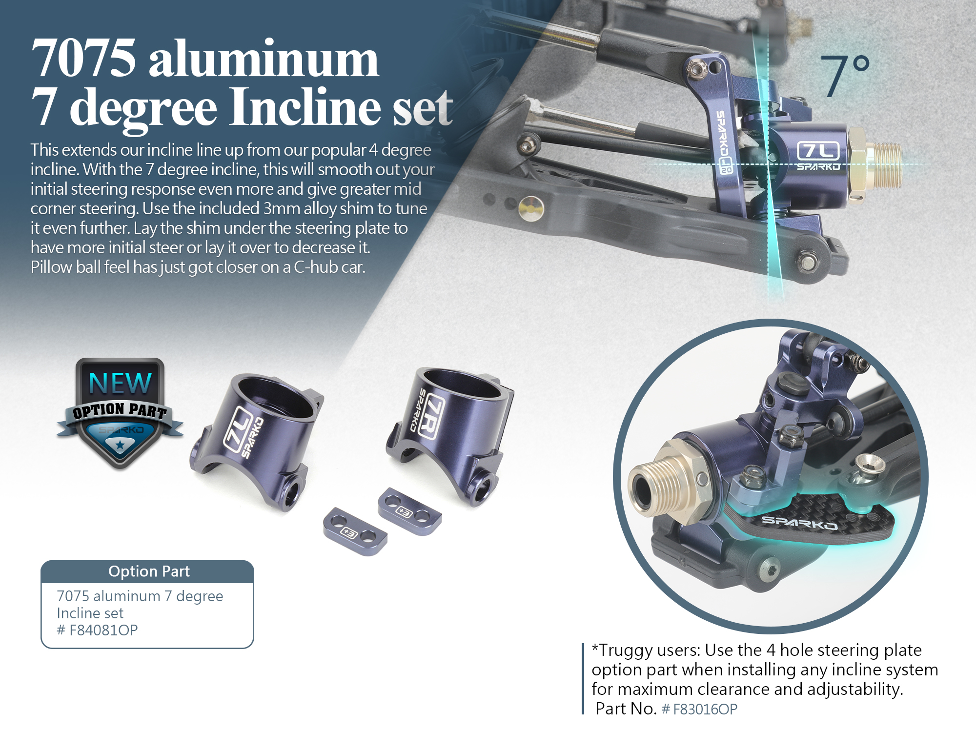 This extends our incline line up from our popular 4 degree incline. With the 7 degree incline, this will smooth out your initial steering response even more and give greater mid corner steering. Use the included 3mm alloy shim to tune it even further. Lay the shim under the steering plate to have more initial steer or lay it over to decrease it. Pillow ball feel has just got closer on a C-hub car.