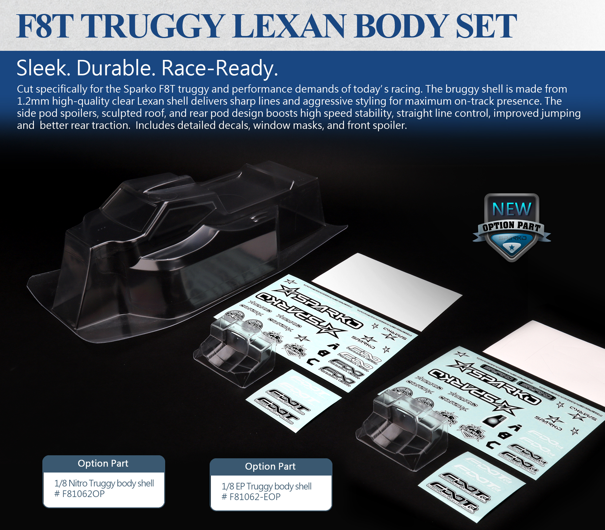 Cut specifically for the Sparko F8T truggy and performance demands of today’s racing. The bruggy shell is made from 1.2mm high-quality clear Lexan shell delivers sharp lines and aggressive styling for maximum on-track presence. The side pod spoilers, sculpted roof, and rear pod design boosts high speed stability, straight line control, improved jumping and better rear traction. Includes detailed decals, window masks, and front spoiler.