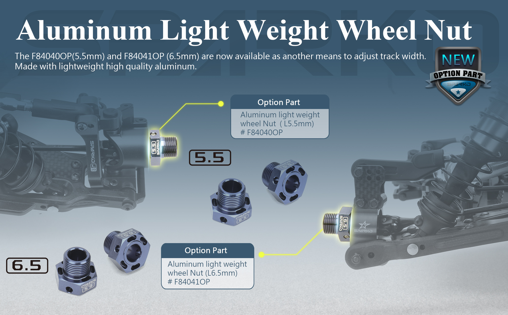 The F84040OP(5.5mm) and F84041OP (6.5mm) are now available as another means to adjust track width. Made with lightweight high quality aluminum.
